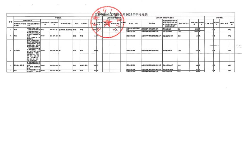 • 巨野潤佳化工有限公司2024年申報報表